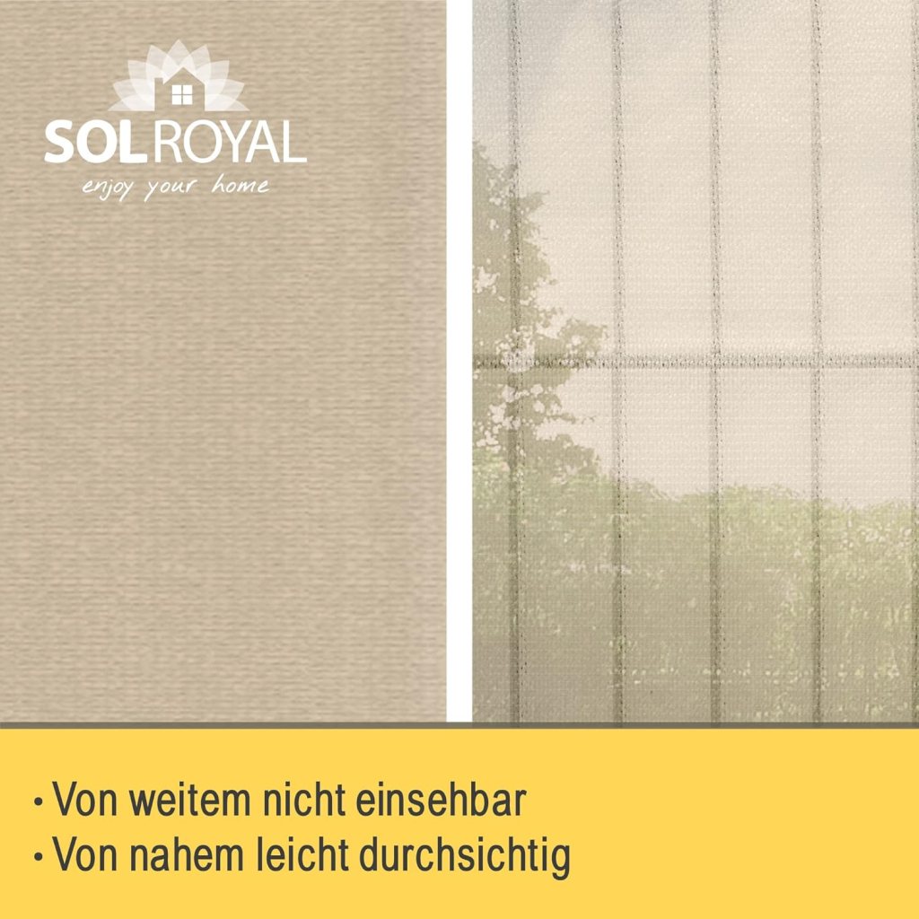 Wer es lieber etwas eleganter mag, für den empfiehlt sich der Sol Royal SolVision Balkon Sichtschutz. Mit einer beeindruckenden Länge von 500 cm und einer Breite von 90 cm bietet diese blickdichte Umspannung optimalen Schutz für dein Balkon-Geländer gegen neugierige Blicke. Die Montage ist dank integrierter Ösen und einer praktischen Kordel besonders einfach und schnell, sodass du im Handumdrehen einen sicheren und ansprechenden Balkon-Balkon Sichtschutz installiert hast, der nicht nur funktional, sondern auch stilvoll ist. Das dezente Creme-Finish harmoniert perfekt mit unterschiedlichsten Dekorstilen und unterstreicht den modernen Charakter deines Außenbereichs, während es gleichzeitig eine einladende Atmosphäre schafft. Darüber hinaus ist der Sichtschutz äußerst widerstandsfähig gegenüber verschiedenen Witterungsbedingungen, was ihn zu einer langlebigen Lösung für deinen Balkon macht und dir ermöglicht, die Privatsphäre und den Komfort in deinem Außenbereich zu genießen, ohne Kompromisse bei der Ästhetik einzugehen.