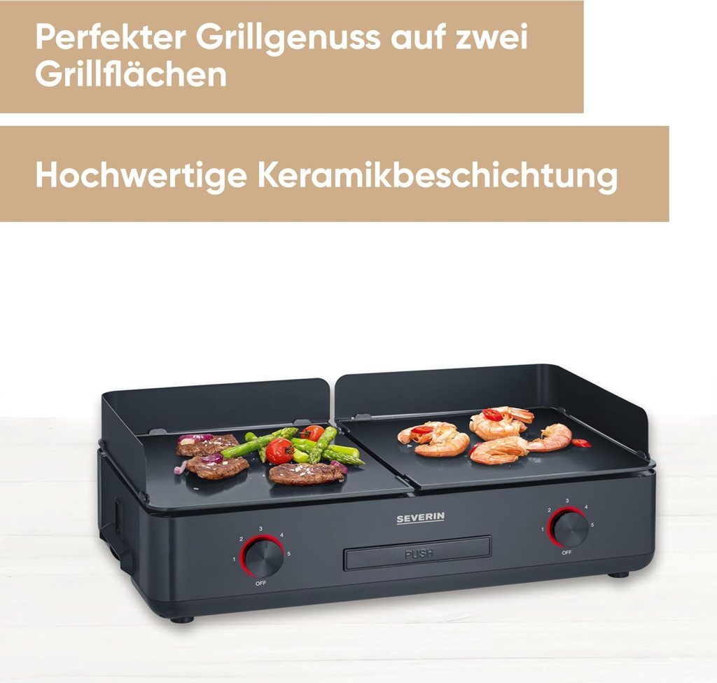 - Der SEVERIN besticht durch separate, keramisch beschichtete Grillflächen und hochpräzise Temperaturregelung.