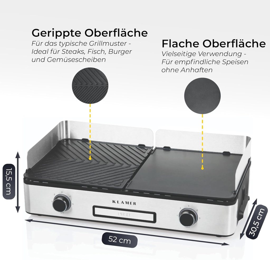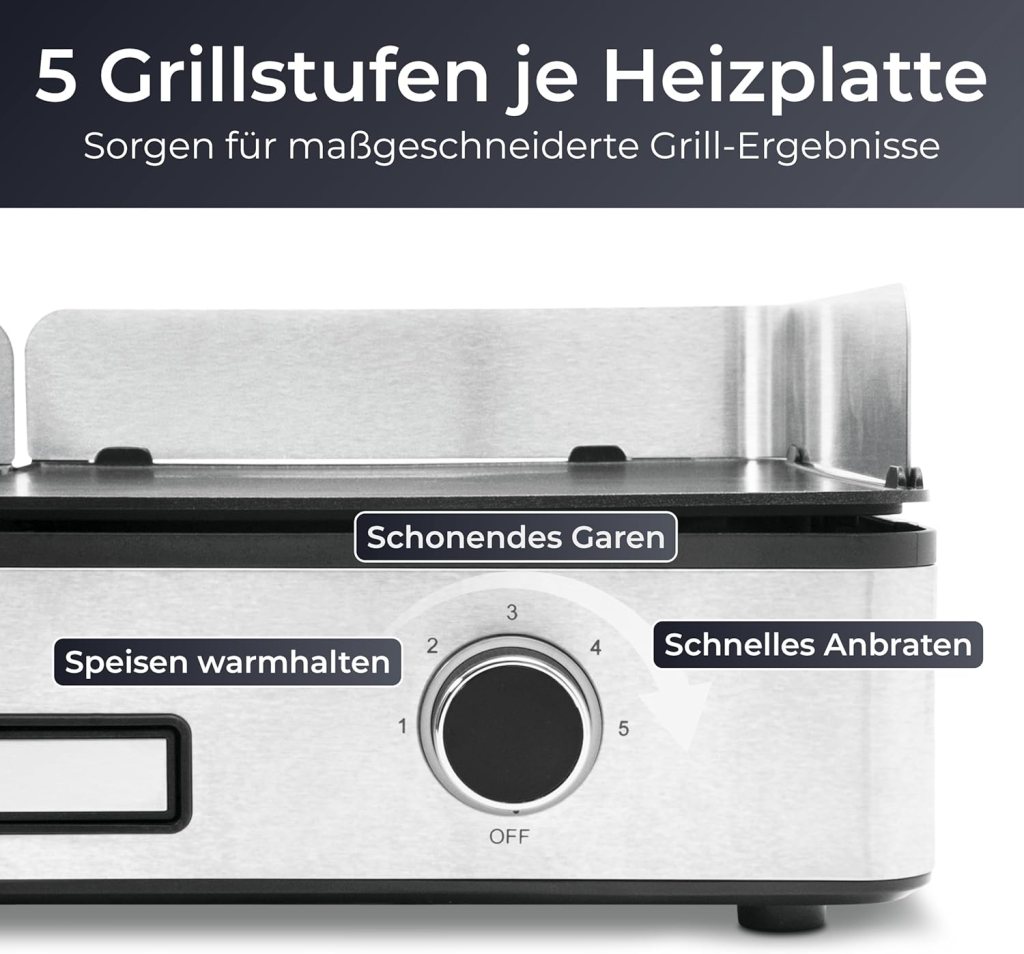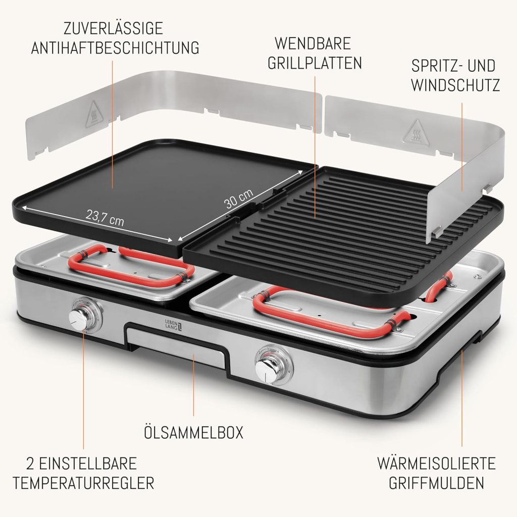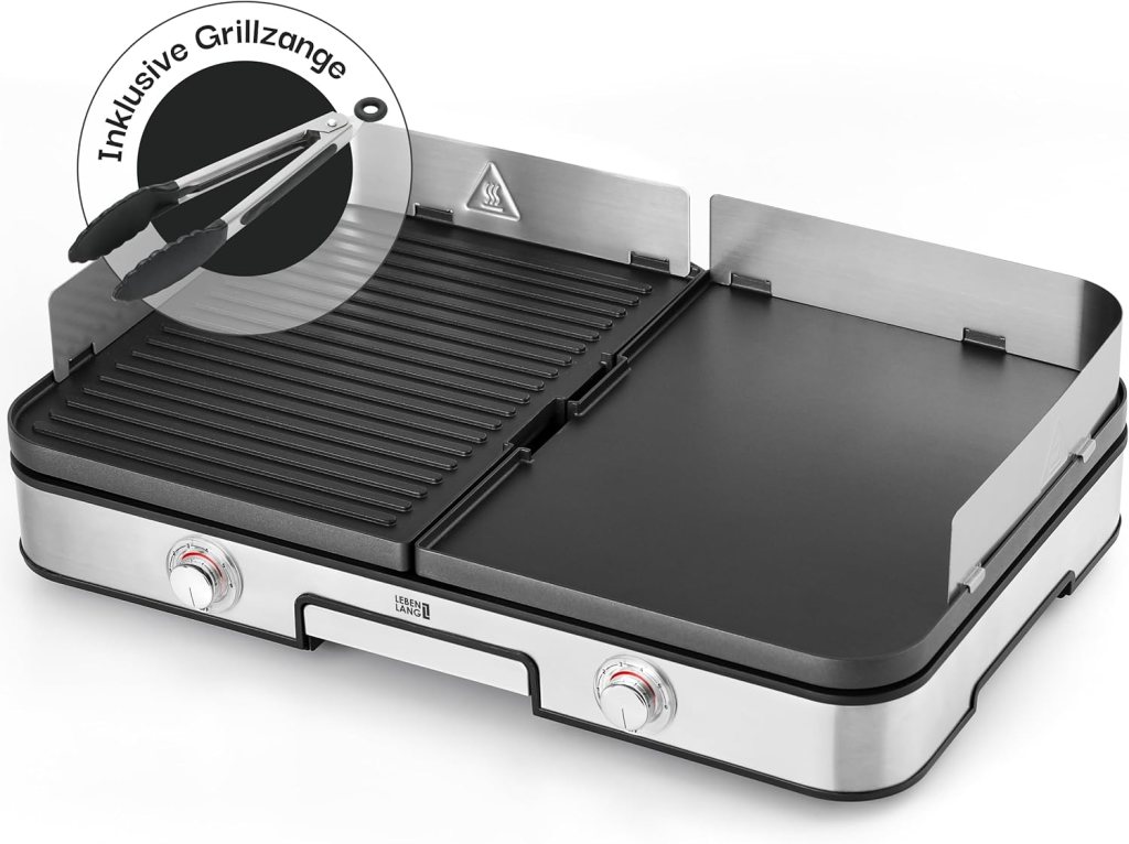 | Bedienkomfort & Reinigung | Einfache Montage und Reinigung dank abnehmbarer Platten und integrierter Auffangschale | Überschüssiges Fett gelangt direkt in eine integrierte Fettauffangschale; abnehmbare Grillplatten erleichtern die Reinigung | Abnehmbare Grillplatten, Spritzschutz und Fettablaufschale – spülmaschinengeeignet, inklusive Grillzange für zusätzlichen Komfort |